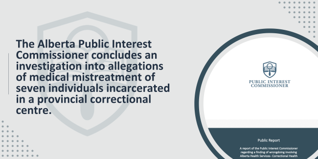 The Alberta Public Interest Commissioner concludes an investigation into allegations of medical mistreatment of seven individuals incarcerated in a provincial correctional centre. The identity and confidentiality of public sector employees wishing to report wrongdoing remains protected under Alberta’s Public Interest Disclosure (Whistleblower Protection) Act. A whistleblower, concerned for the health and safety of individuals incarcerated…