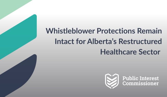 Due to the ongoing implementation of changes to Alberta’s healthcare sector, the Public Interest Commissioner today clarified the impact of these changes on the Public Interest Disclosure (Whistleblower Protection) Act (The Act), assuring healthcare employees that they have a safe avenue for reporting workplace wrongdoing or reprisal. “Change can sometimes create uncertainty, and I want to ensure that all healthcare employees know that they can safely report wrongdoing or reprisal.” – Kevin Brezinski, Public Interest Commissioner The restructure replaced…