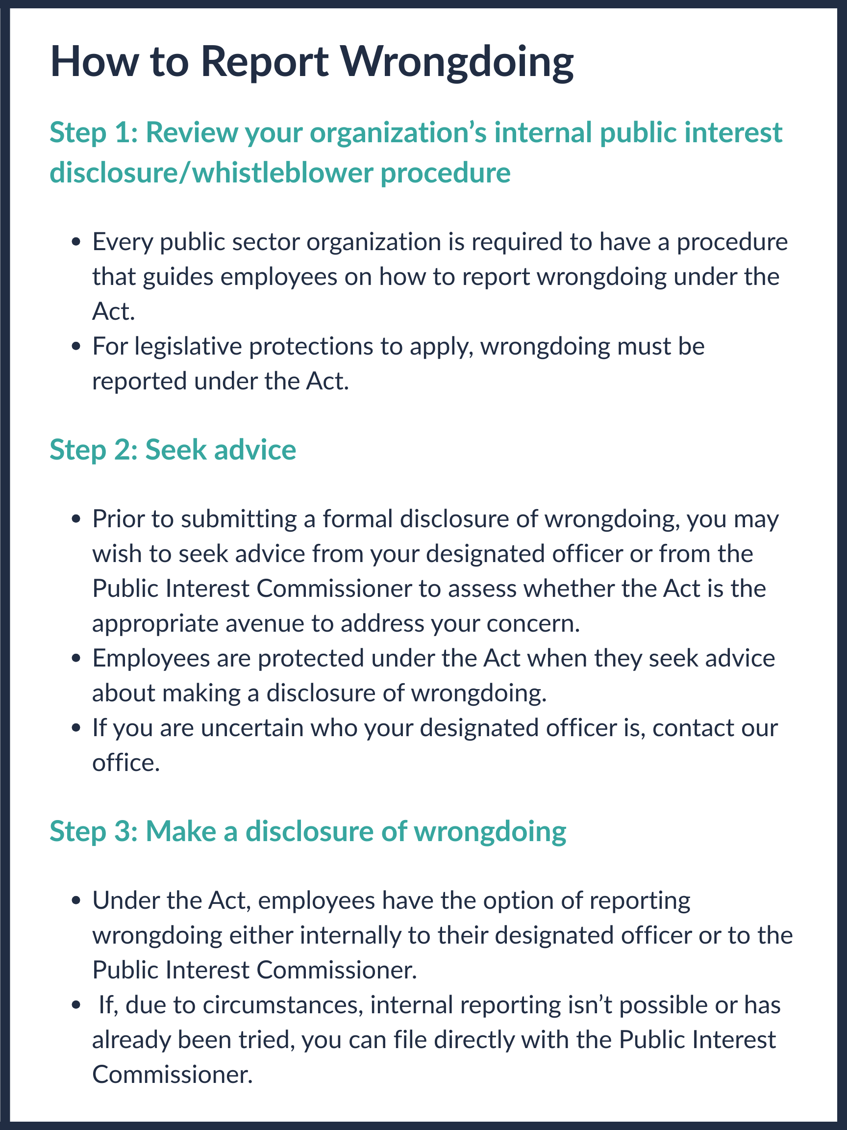Employees can confidently report complaints of serious and significant wrongdoing internally to their designated officer or to the Public Interest Commissioner. The Commissioner’s office conducts independent, impartial, and procedurally fair investigations into these complaints. Click here to learn more about reporting wrongdoing.